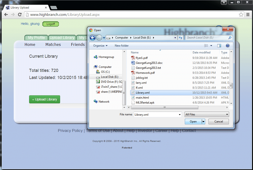 3. From the Highbranch.com website, select the "Upload Library" tab